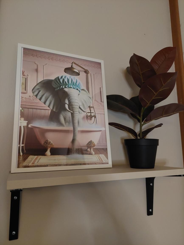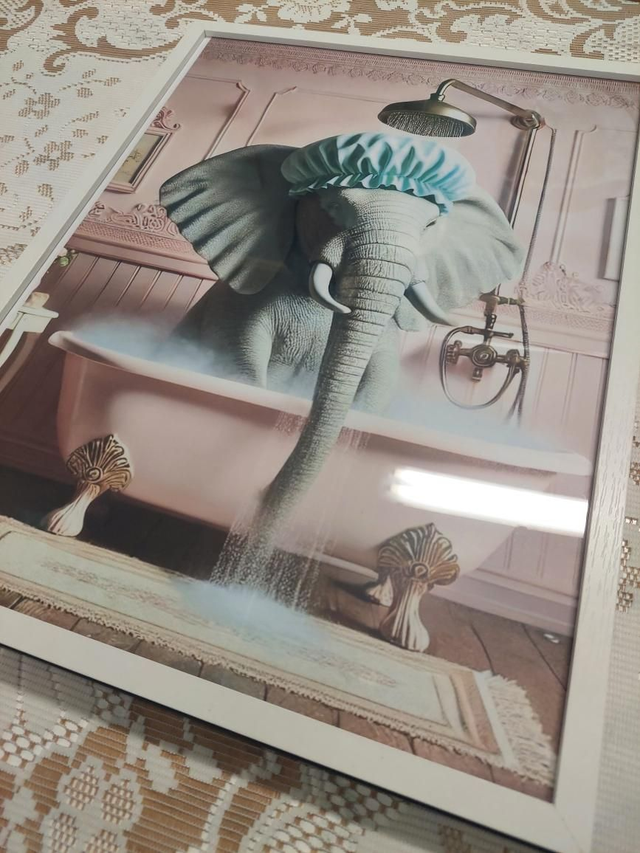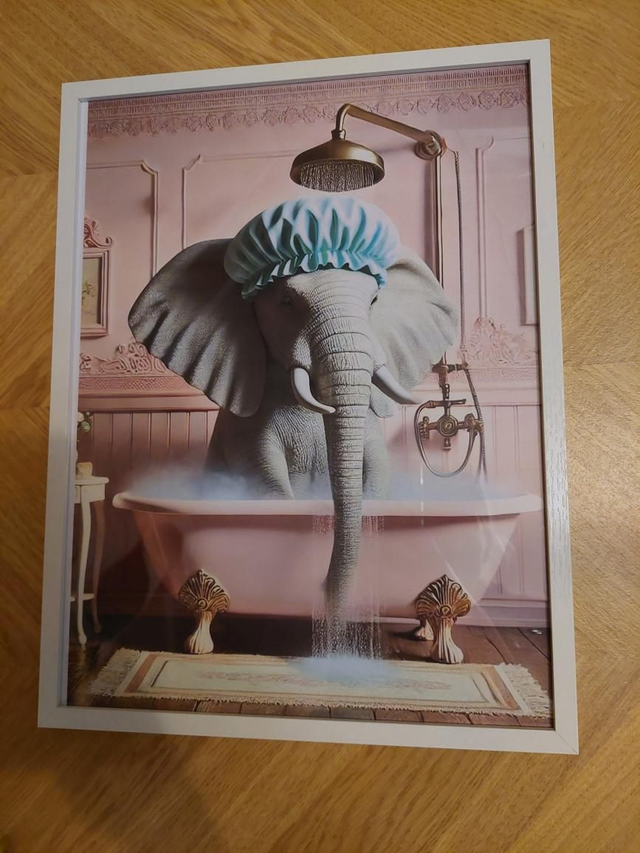 A3 koon taulu, valkoinen kehys, norsu kylvyssä