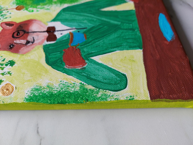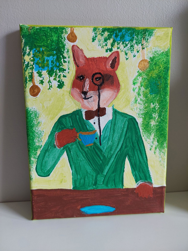 Kettu teellä Akryyli, sekatekniikka, canvaspohja Koko: 18 x 24 cm Leikkisä kettu teekutsuilla, missä höyry nousee tarinoista
