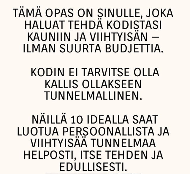 🔸 "Kaunis koti pienellä rahalla" Täynnä DIY-vinkkejä ja sisustusideoita, joilla päivität kotisi tunnelman ilman suurta budjettia.