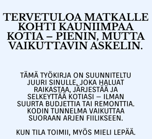 🔸 "Kodin muodonmuutos – Selkeytä, suunnittele ja sisusta" (työkirja) Täytettävä, ajatuksia herättävä työkirja, joka auttaa sinua etenemään kohti viihtyisämpää kotia, yksi tila ja tunne kerrallaan.