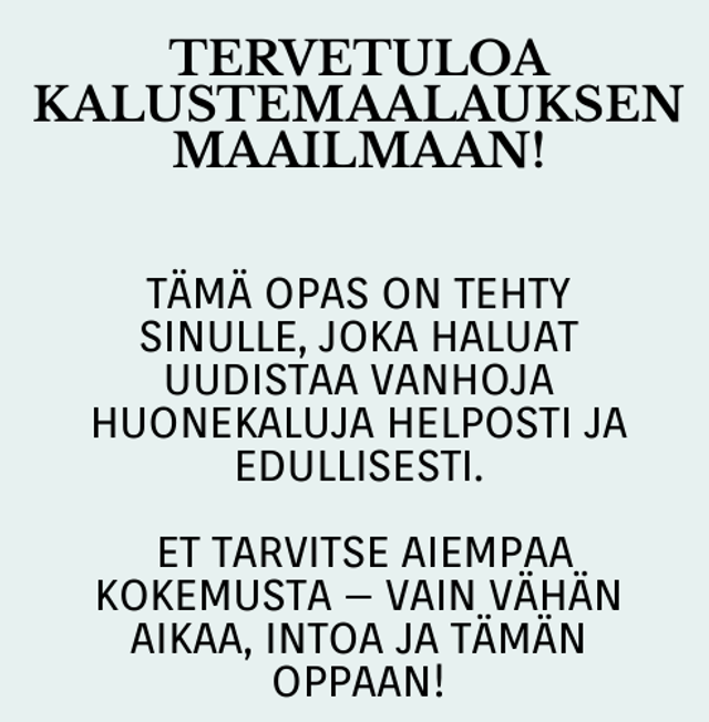 🔸 "Kalustemaalauksen aloituspaketti" Käytännönläheinen minikäsikirja sinulle, joka haluat uudistaa kalusteita helposti ja onnistuneesti, vaikka ihan ensimmäistä kertaa.