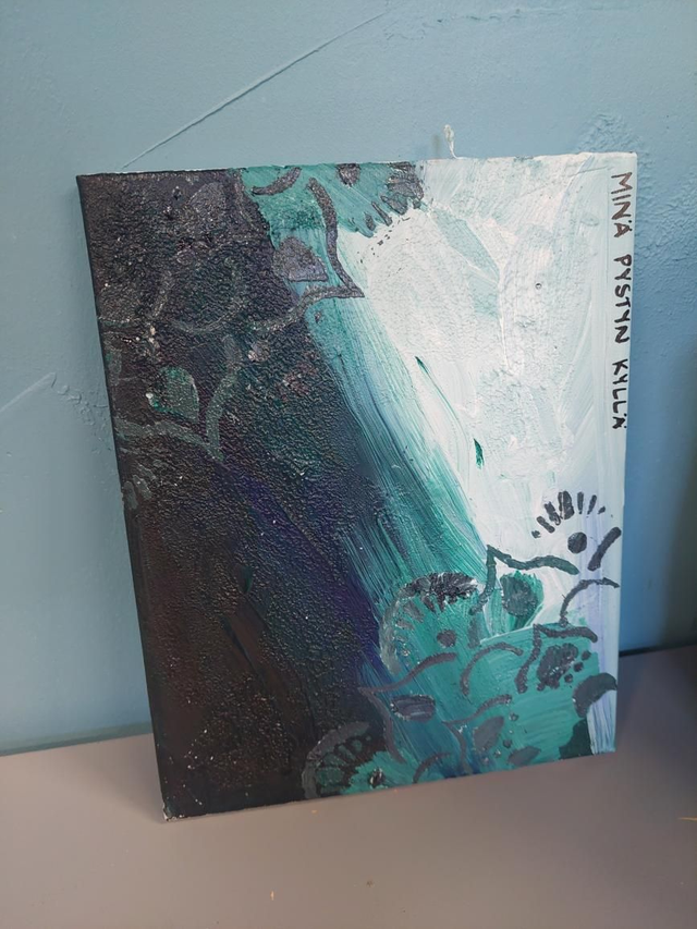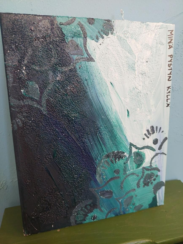 Tekstitaulu akryylimaaleilla canvas pohjalle, sekatekniikka