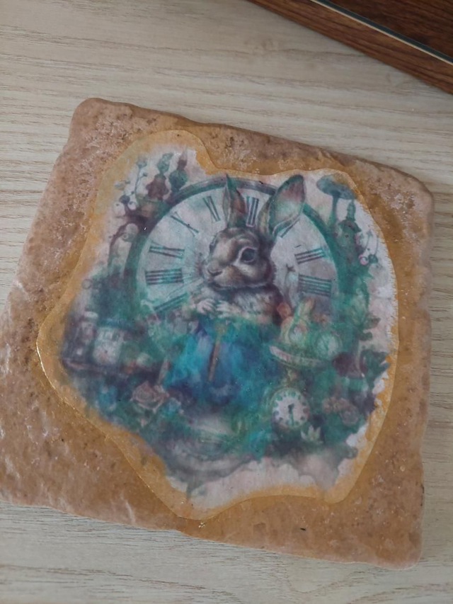 Yksittäinen pupu ihmemaassa kappale! Koko 15x15cm. Käytä lasinalusena, kattaukseen, pannunalusena, ruukun alla tms. Kaunis pitää esillä. Huopatassut taustapuolella